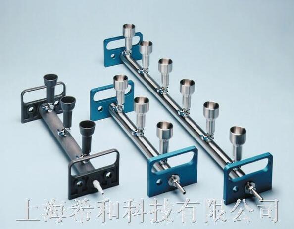 真空多联装置同时过滤 3 个或 6 个检测样品。 使用接头标准 8 号孔塞的 Millipore 玻璃、塑料或不锈钢换膜过滤器。 多联装置与单个真空源相连,每个操作点可用各自的控制阀独立操作。 将每个操作点的不锈钢多联装置的排气孔与 Swinnex 换膜过滤器或 Millex 过滤器连接可保持检测滤膜下游端无 菌。
